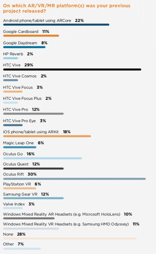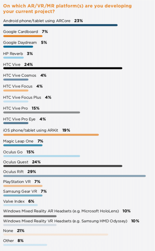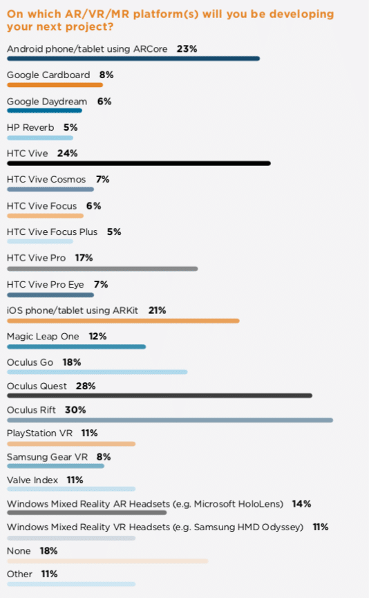 For headset based AR, Windows Mixed Reality (Hololens) is in the lead by 10 percent of current projects. But more notably, that jumps to 14 percent for reported future projects. Magic Leap isn’t far behind, growing from 7 percent of current projects to 12 percent of future interest.