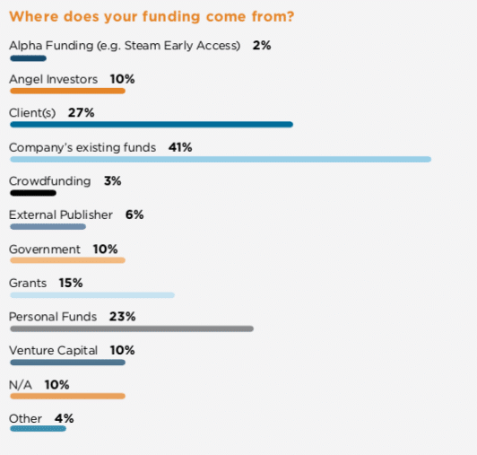 Lastly, in terms of business metrics, most companies’ funding sources (41 percent) come from the somewhat ambiguous “existing funds.” The second-biggest category is “clients,” indicating measured bootstrapping activity and real revenue. This is a good sign for immersive computing.