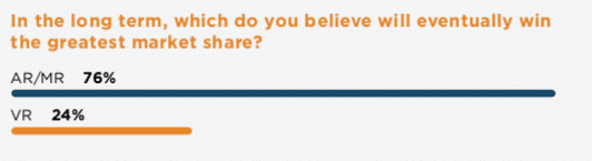 As for the overall split of AR and VR, the vast majority of respondents (76 percent) believe the former will have a greater market share. “Market share” is probably the wrong term, as they’re not competing in the same markets, but the point is taken that AR has greater monetization potential.