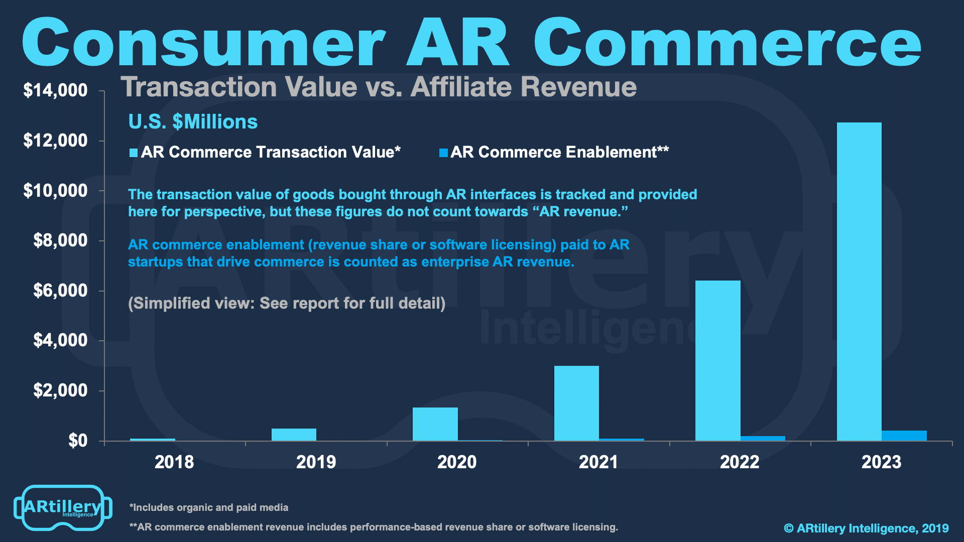 As a corollary to advertising, ARtillery Intelligence projects $12.7 billion in products to be purchased through AR interfaces by 2023 (not counted as “AR revenue”)*. This will drive affiliate revenue (counted as “AR revenue”)* for AR ad-tech startups to the tune of $404 million by 2023.