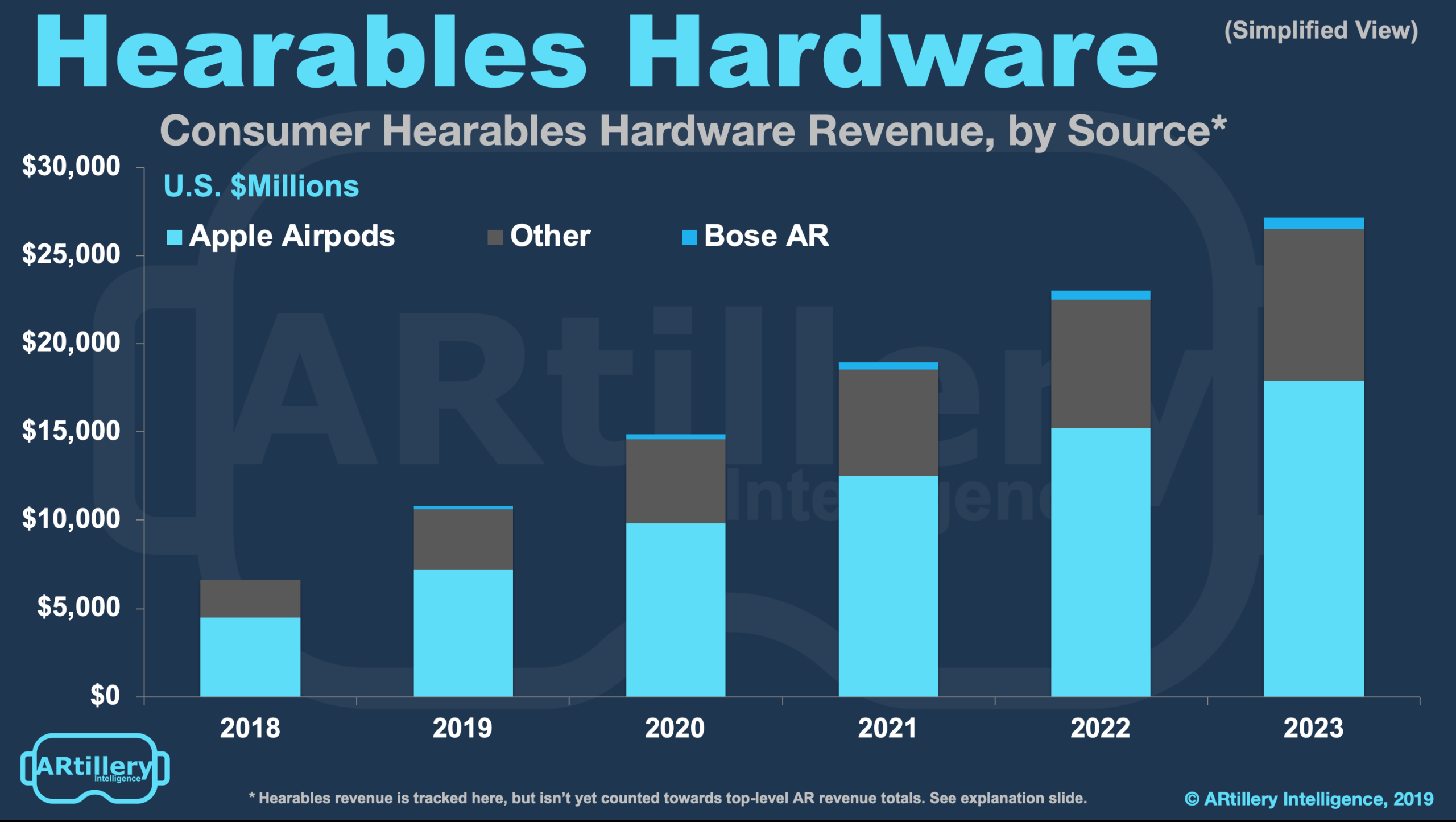 The opportunity also builds on an existing base of hearables like AirPods, which sold 25 million units last year and are on pace for 80 million units by 2023. Commodity players will follow as is often the case; and the ensuing hardware penetration will be the first step to audio AR.
