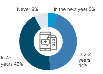 Related to the matter of timing is a question of when adoption trend lines between mobile AR and smart glasses will intersect. 44 percent believe it’s in 2-3 years and 43 percent think 4+ years. A minority (5 percent) think within one year and 8 percent think it will never happen.
