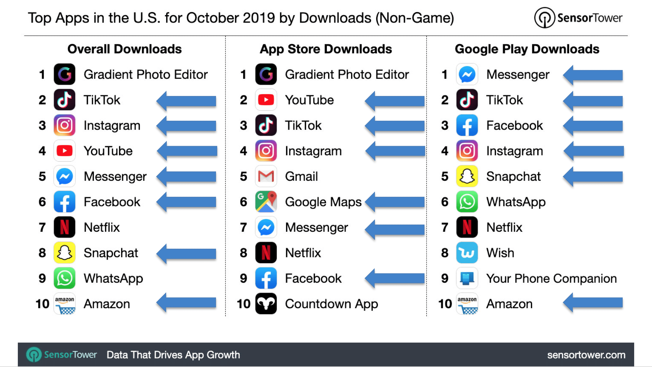 Supporting AR’s penetration is data from Sensor Tower that show top U.S. mobile app downloads in October. What struck us is that seven of the top ten apps feature AR to varying degrees. This is a U.S.-only list (and non-gaming) but is still a good proxy for AR penetration and exposure.