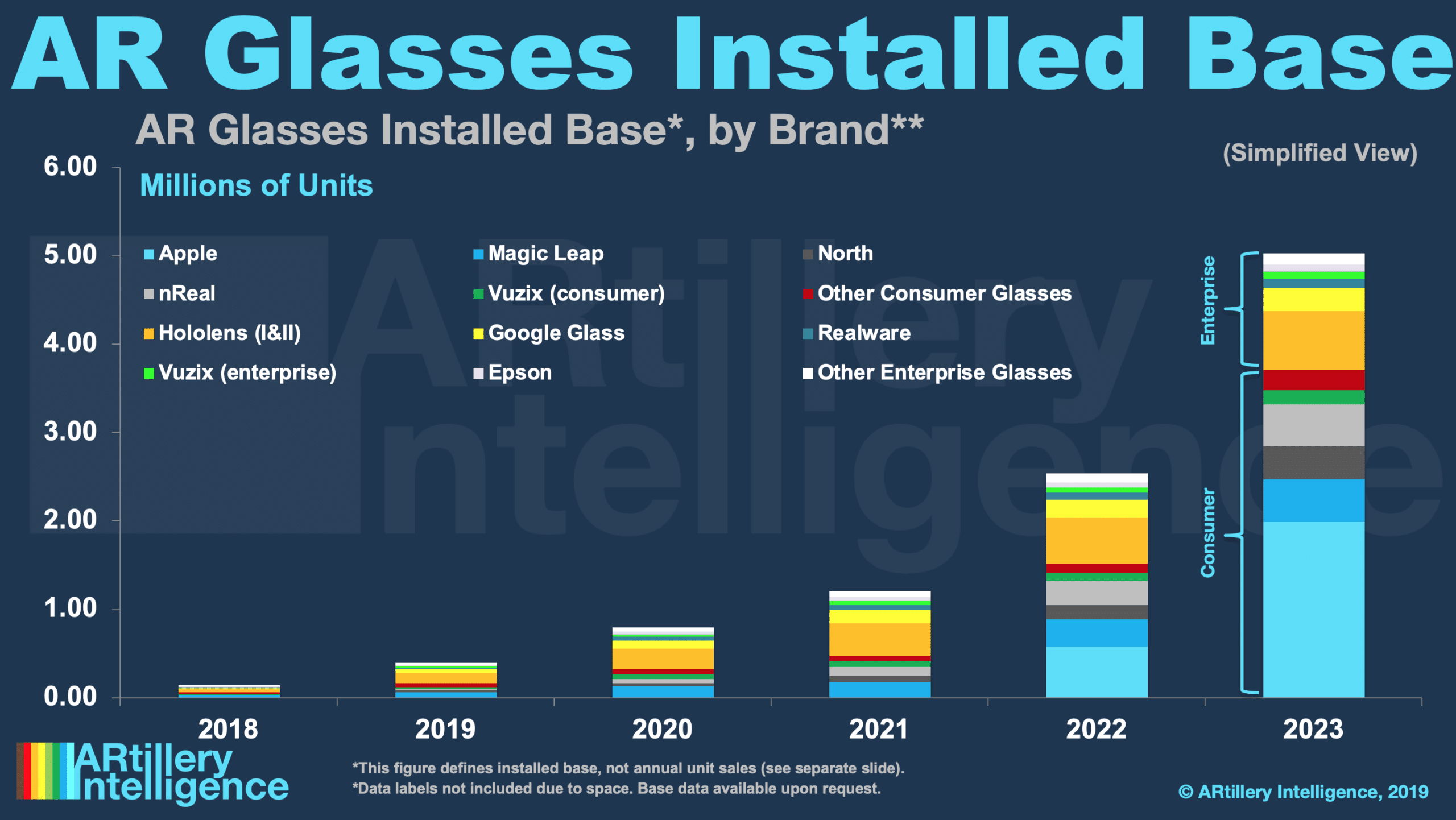 The eventual target is a likely an all-day wearable. That could take form in a multi-modal device with variable-opacity lenses for occluded entertainment, and utility-driven AR. Meanwhile, ARtillery projects Apple unit sales of just over 1 million in 2022, followed by almost 3 million in 2023.
