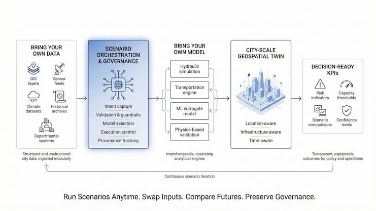 One of the most persistent misconceptions in urban simulation is that cities lack tools when in reality, they often have too many, ranging from GIS layers and sensor feeds to historical baselines, consultant-built hydraulic models, and university-developed AI predictors. The challenge is not capability, but orchestration.