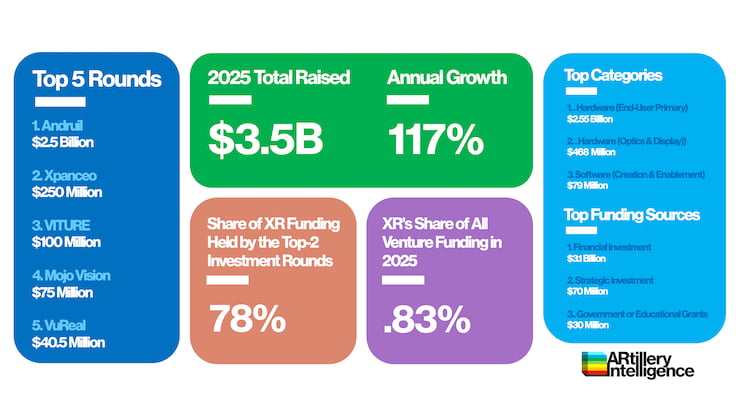 LOS ANGELES, April 30, 2026: ARtillery Intelligence has released a new report that says global funding for private XR companies reached $3.5 billion in 2025. This is a 117 percent year-over-year increase, which reverses a three-year decline in annual XR funding. Entitled Follow the Money: XR Funding Roundup, Volume 2, the annual study tracks spatial computing sector funding, subsegment breakdowns, trend analysis, and strategic insights.